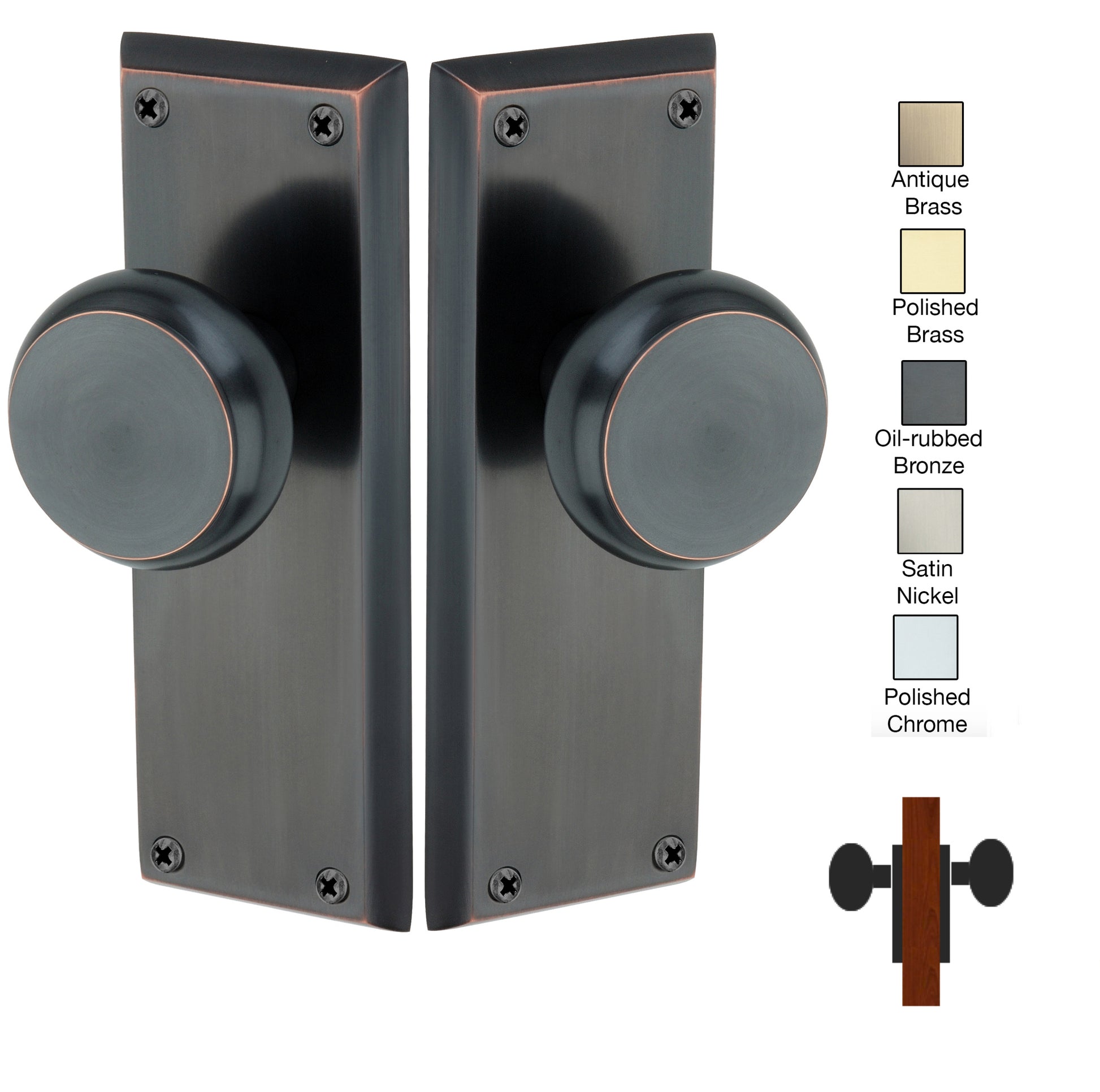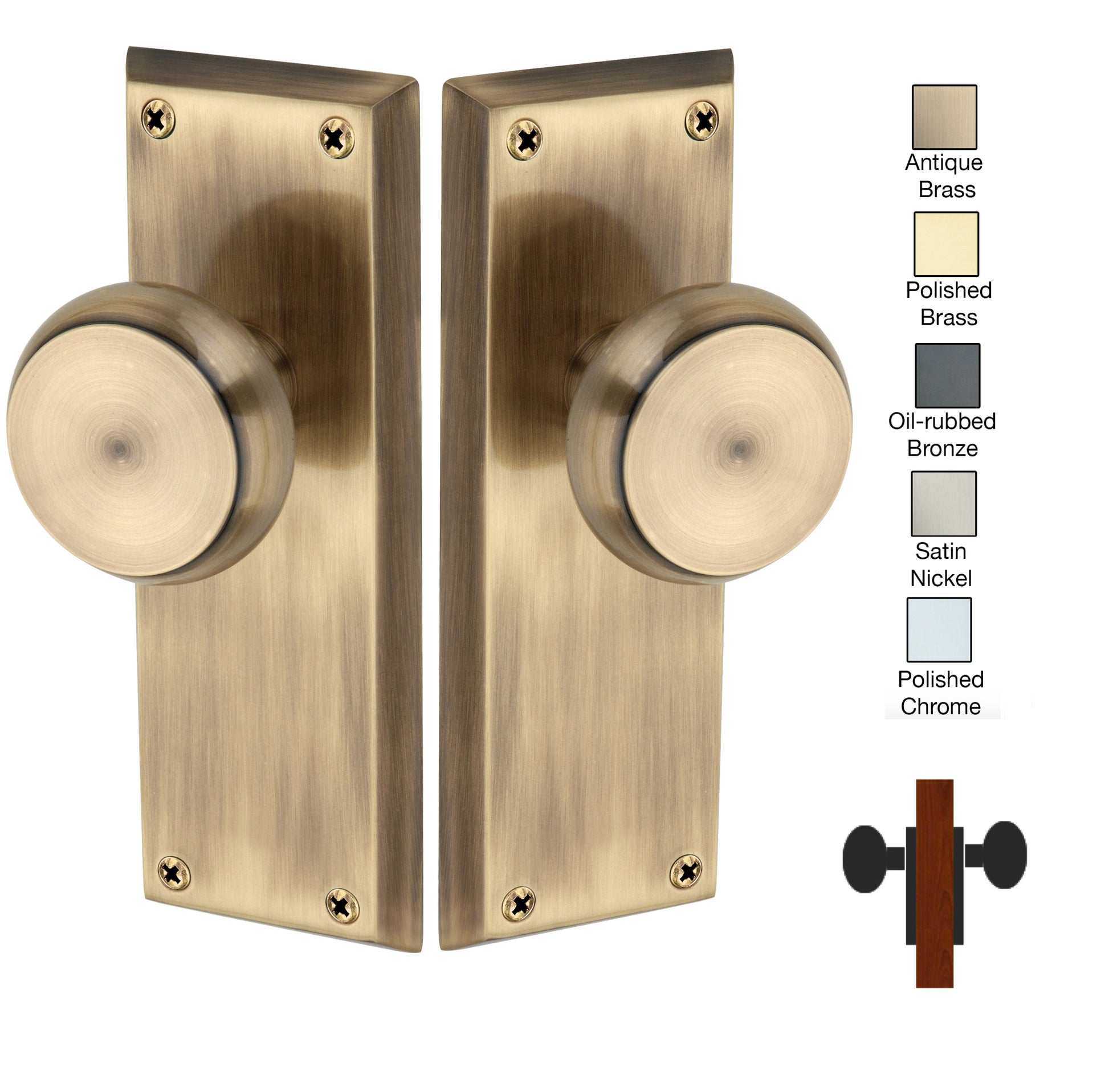 This is a non-functioning door knob pair with no latch, used for push/pull function only. All brass parts are Solid Forged Brass (not just Brass plated). It is surface mounted and mounts directly to Door. Comes Complete with Mounting Hardware. The design of these premium Door Knobs with a forged brass rose will fit perfectly into a vintage or new door.Finishes: