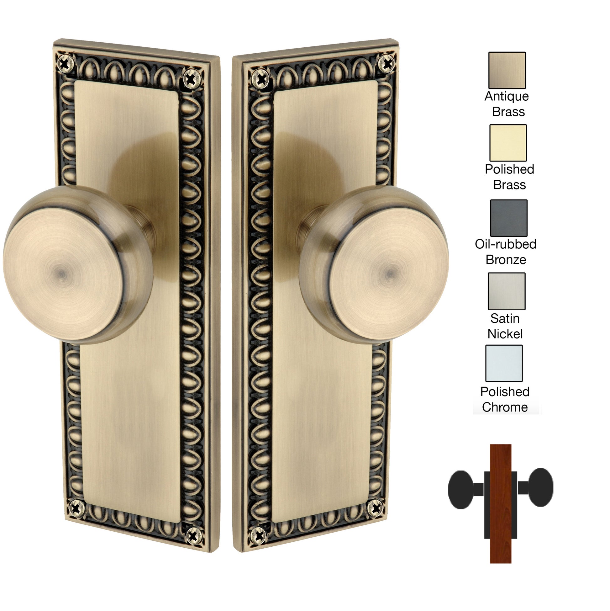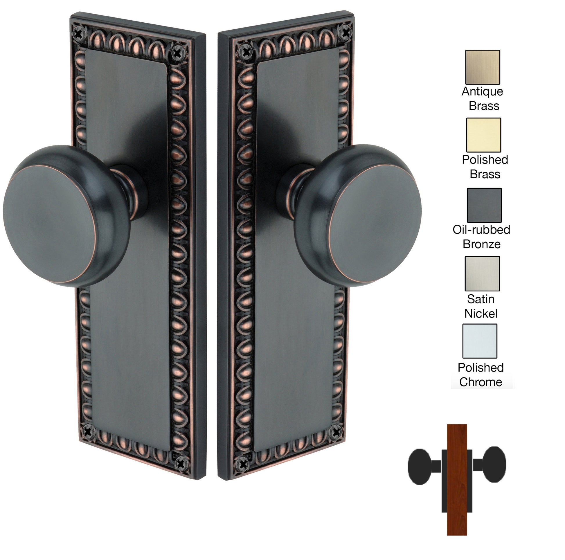 This is a non-functioning door knob pair with no latch, used for push/pull function only. All brass parts are Solid Forged Brass (not just Brass plated). It is surface mounted and mounts directly to Door. Comes Complete with Mounting Hardware. The design of these premium Door Knobs with a forged brass rose will fit perfectly into a vintage or new door.Finishes: