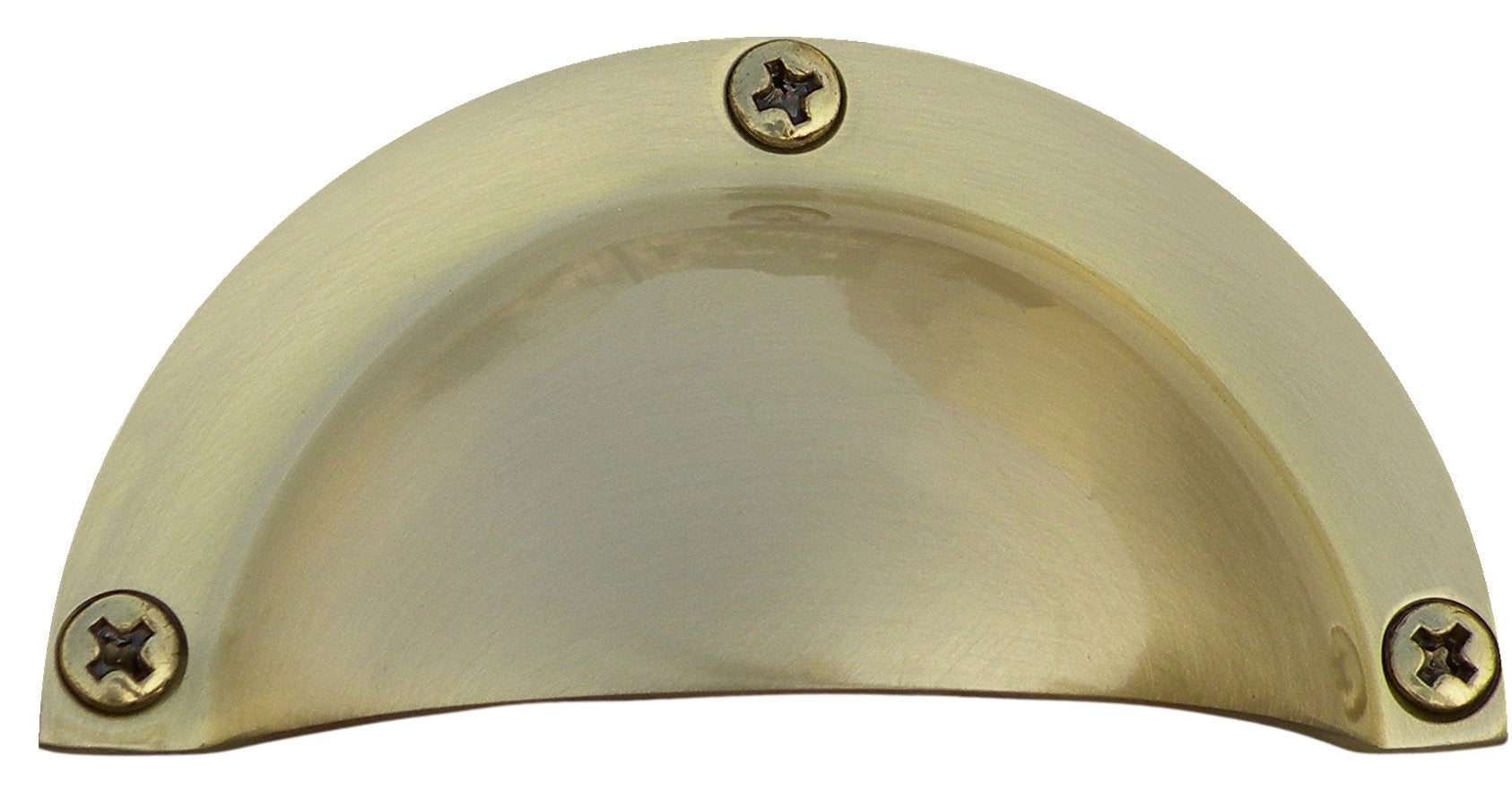 Details: Contemporary Forged Satin Brass Cup Drawer / Cabinet pull Handle,decorative,metal finishes,brass,solid brass,heavy duty,home,indoor,office,kitchen,outlets,commercial,residential
